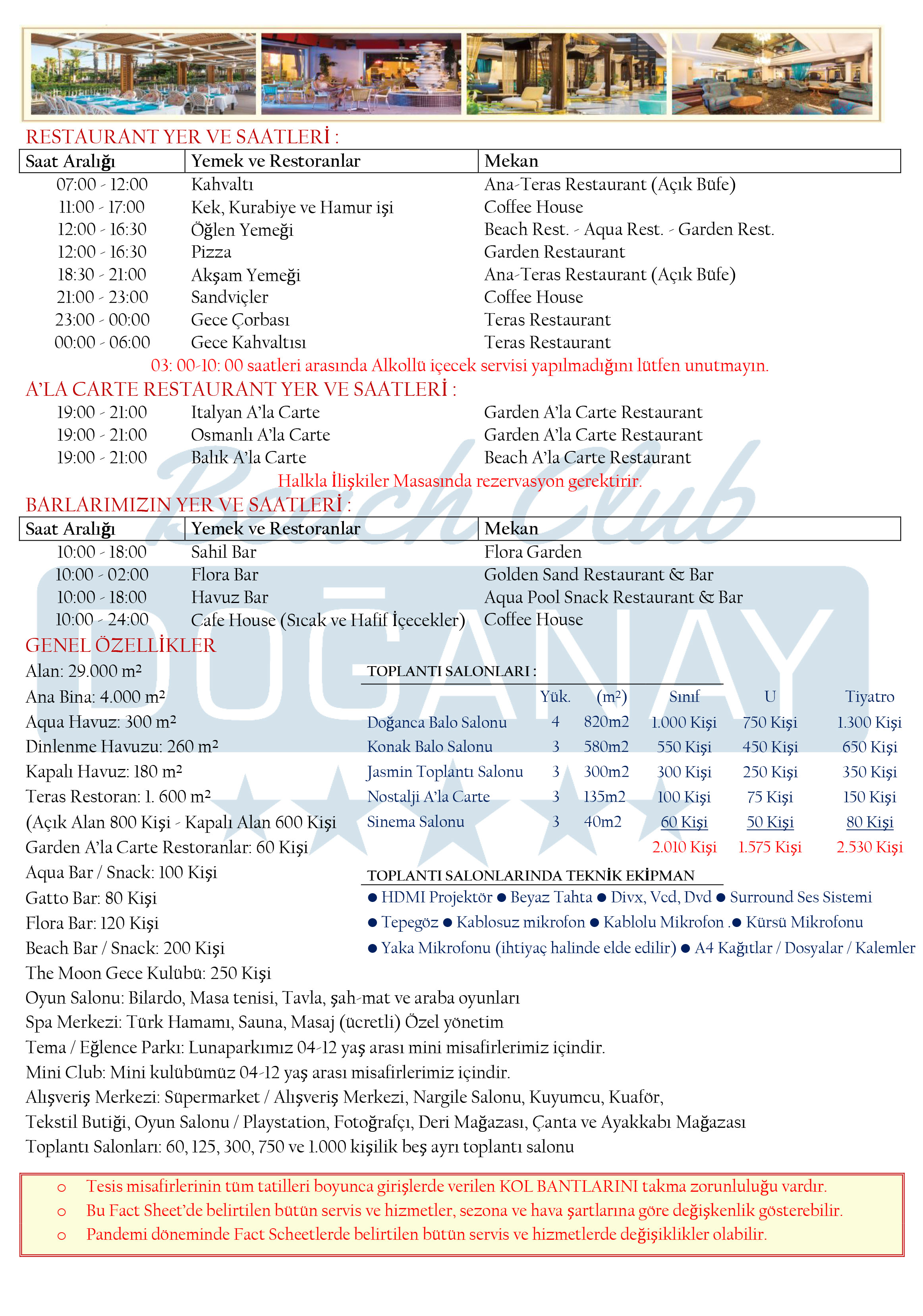 Ana restoran, Flora Garden İtalyan A'la Carte, Flora Garden Osmanlı A'la Carte, Sahil Balık A'la Carte, İskele Ustu Akdeniz VIP A'la Carte, Beach Restaurant, Coffee House